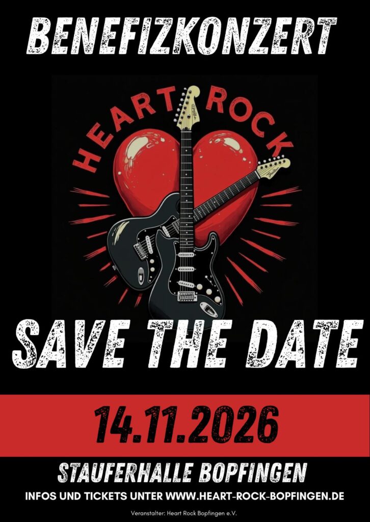 Nach dem überragenden Erfolg unserer ersten Veranstaltung, wird der Heart Rock Bopfingen e.V. auch 2026 wieder ein Benefizkonzert veranstalten. Am Konzept ändert sich nichts: Die Veranstaltung steht ganz im Zeichen des Rock – mehrere Bands und Acts, darunter auch die HEART ROCK HOUSEBAND, werden sowohl mit eigenen Songs aber auch mit Cover-Rock für Stimmung sorgen und die Rocker-Herzen höher schlagen lassen. Die Vorbereitungen laufen bereits auf Hochtouren und am Ipfmess-Countdown werden wir das Line-Up veröffentlichen und mit dem Kartenvorverkauf starten. Tragt Euch den 14.11.2026 also schonmal fett in Eure Kalender ein.